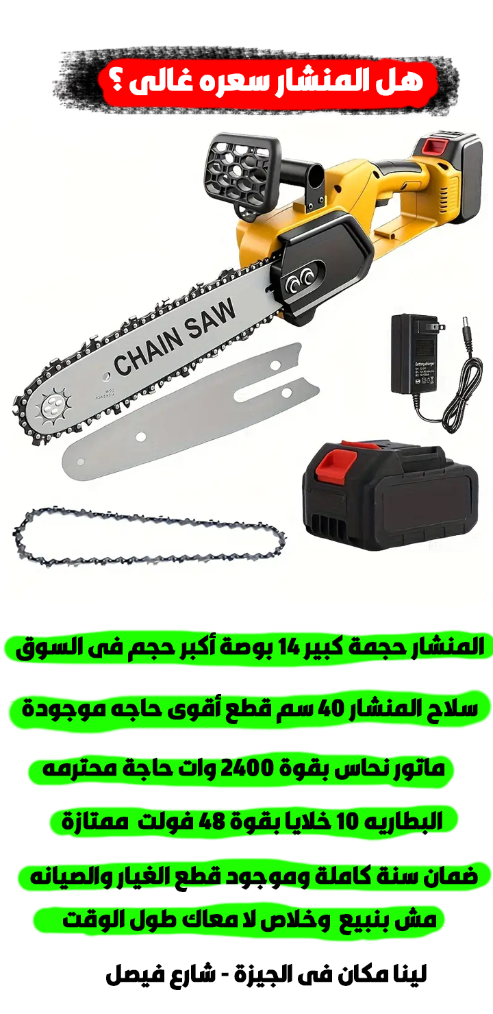 "شوف الصورة على الطبيعة… منشار 14 بوصة الحجم الكبير بطول 40 سم، مش زي الصغير 8 بوصة وطوله 20 سم! يوصللك في شنطة مقاومة للصدمات، وبنرسللك طريقة التركيب، وبنتابع معاك، مع ضمان سنة وقطع غيار متوفرة."
