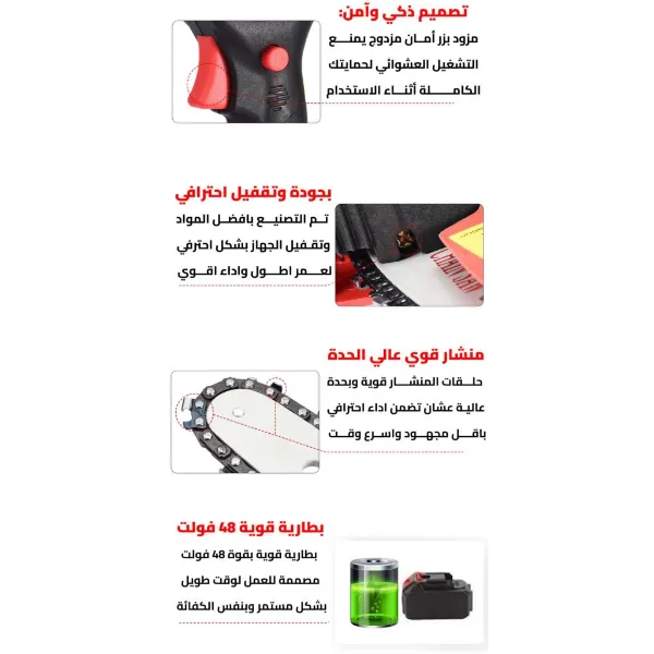 "موتور قوي 2400 مع فتحات تهوية للمحافظة على برودته، بطارية 48V مع 10 خلايا كبيرة، مزود بزر أمان، وطبه للزيت وجنزير قوي يتحمل أي شغل."